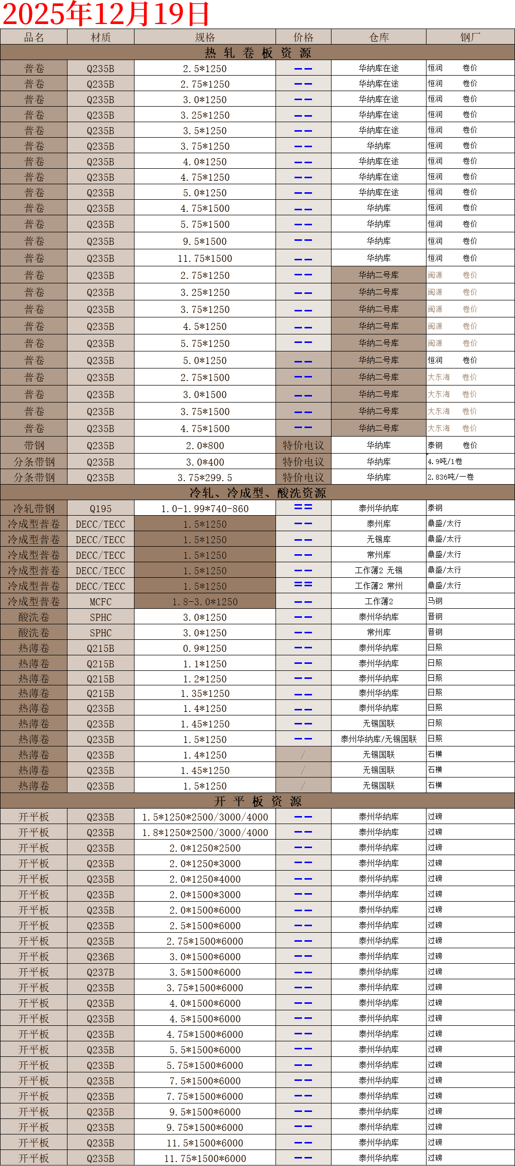 市场变化较快,实际成交价格以电询为准!报价说明 :以上卷板报价均为整件含开价,正常库存开平板出售+50需定开3米以上(包括3米)非整件+60,需定开2-3米非整件+70(包括2米),非整件小于1米-2米+80(包括1米),小于1米另计