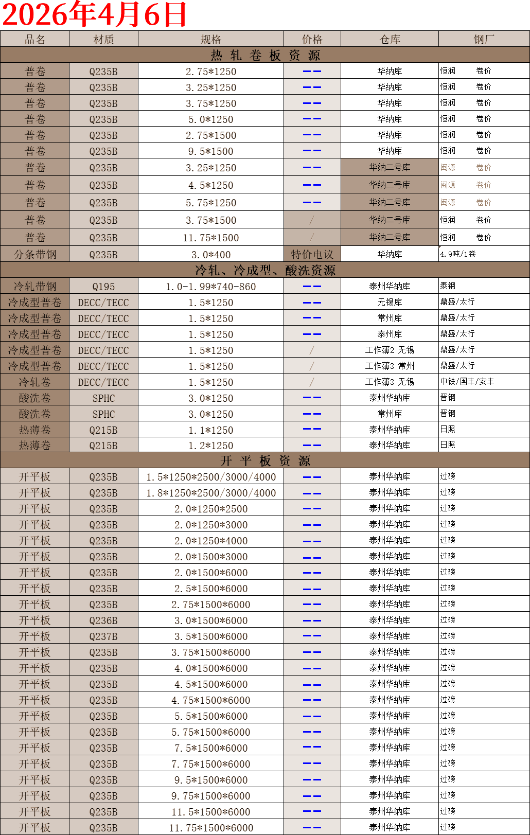 市场变化较快,实际成交价格以电询为准!报价说明 :以上卷板报价均为整件含开价,正常库存开平板出售+50需定开3米以上(包括3米)非整件+60,需定开2-3米非整件+70(包括2米),非整件小于1米-2米+80(包括1米),小于1米另计