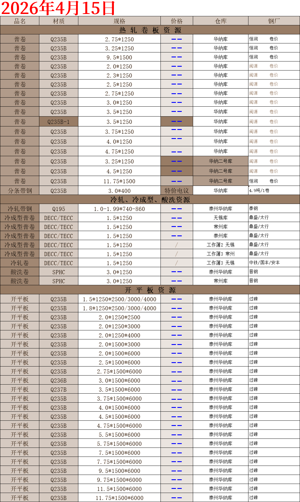 市场变化较快,实际成交价格以电询为准!报价说明 :以上卷板报价均为整件含开价,正常库存开平板出售+50需定开3米以上(包括3米)非整件+60,需定开2-3米非整件+70(包括2米),非整件小于1米-2米+80(包括1米),小于1米另计