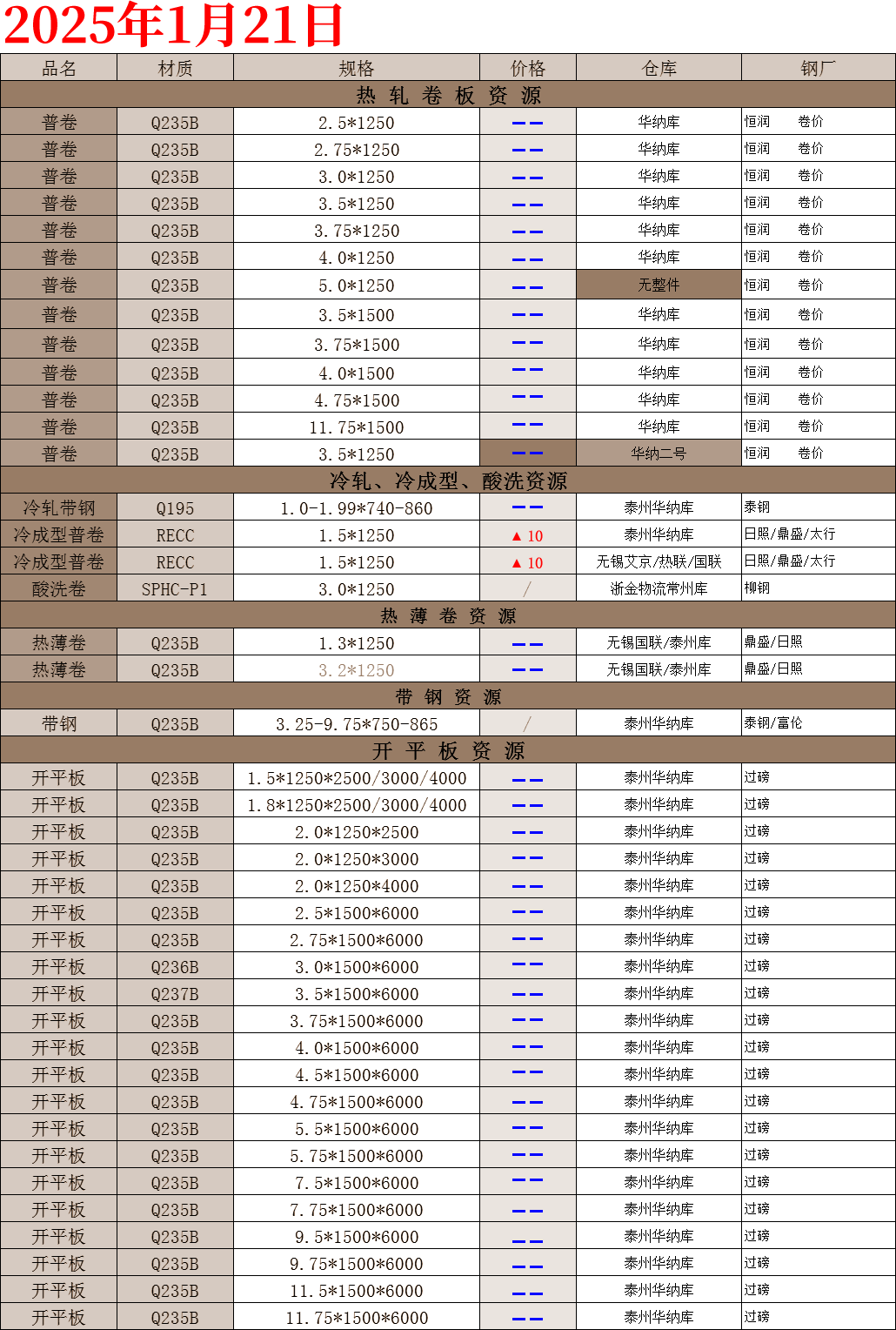 市场变化较快,实际成交价格以电询为准!报价说明 :以上卷板报价均为整件含开价,正常库存开平板出售+50需定开3米以上(包括3米)非整件+60,需定开2-3米非整件+70(包括2米),非整件小于1米-2米+80(包括1米),小于1米另计