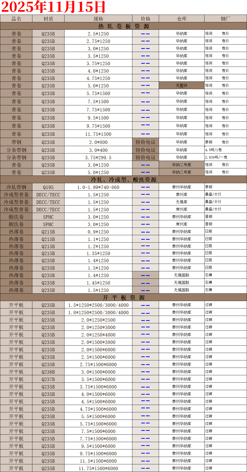 市场变化较快,实际成交价格以电询为准!报价说明 :以上卷板报价均为整件含开价,正常库存开平板出售+50需定开3米以上(包括3米)非整件+60,需定开2-3米非整件+70(包括2米),非整件小于1米-2米+80(包括1米),小于1米另计