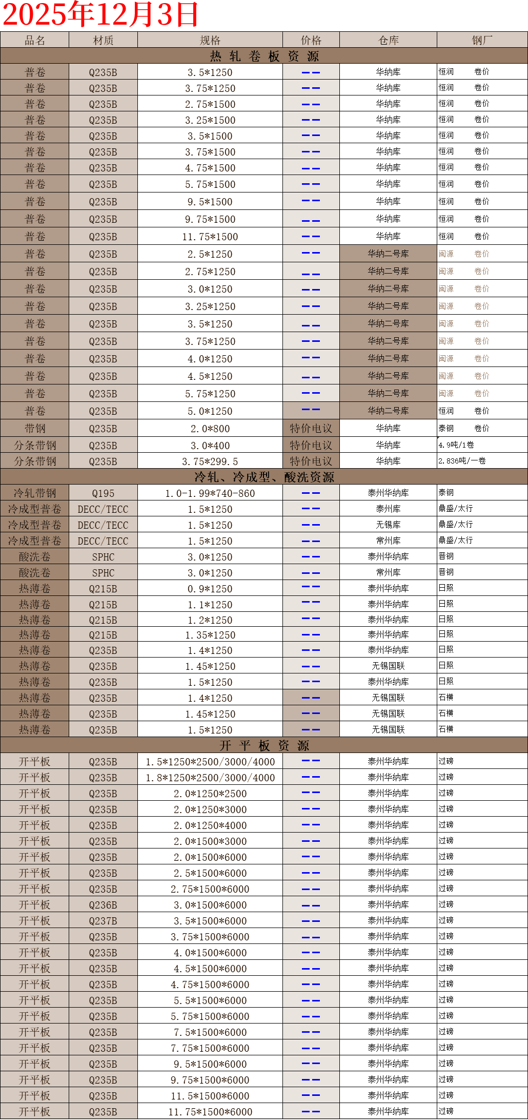 市场变化较快,实际成交价格以电询为准!报价说明 :以上卷板报价均为整件含开价,正常库存开平板出售+50需定开3米以上(包括3米)非整件+60,需定开2-3米非整件+70(包括2米),非整件小于1米-2米+80(包括1米),小于1米另计