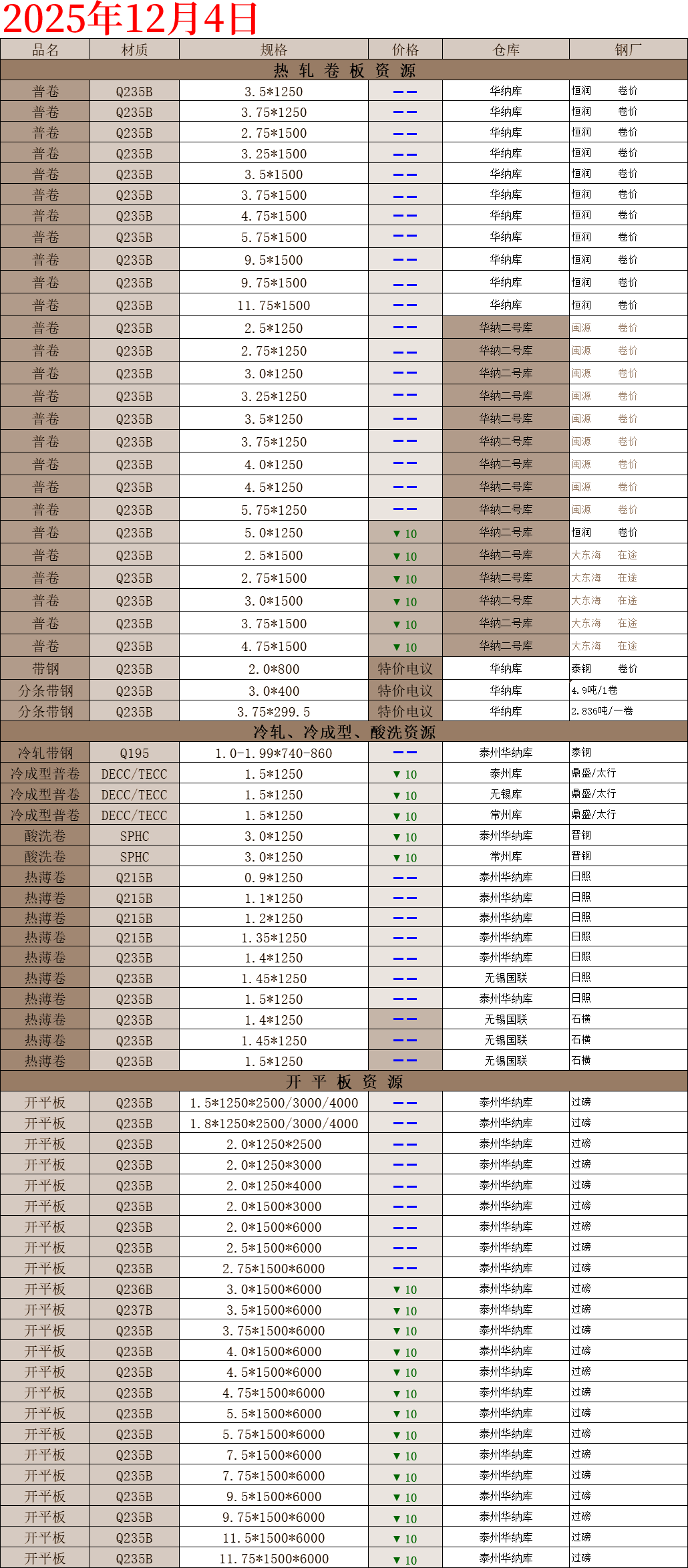 市场变化较快,实际成交价格以电询为准!报价说明 :以上卷板报价均为整件含开价,正常库存开平板出售+50需定开3米以上(包括3米)非整件+60,需定开2-3米非整件+70(包括2米),非整件小于1米-2米+80(包括1米),小于1米另计