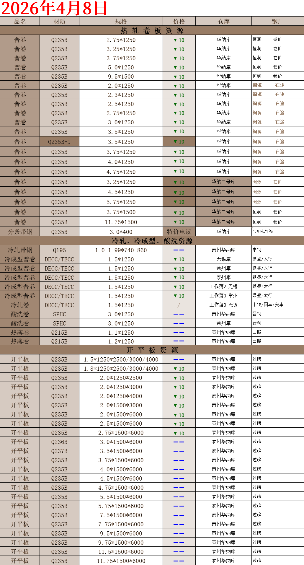 市场变化较快,实际成交价格以电询为准!报价说明 :以上卷板报价均为整件含开价,正常库存开平板出售+50需定开3米以上(包括3米)非整件+60,需定开2-3米非整件+70(包括2米),非整件小于1米-2米+80(包括1米),小于1米另计